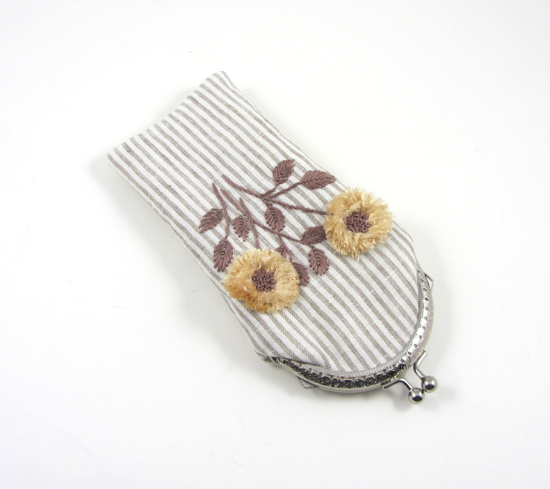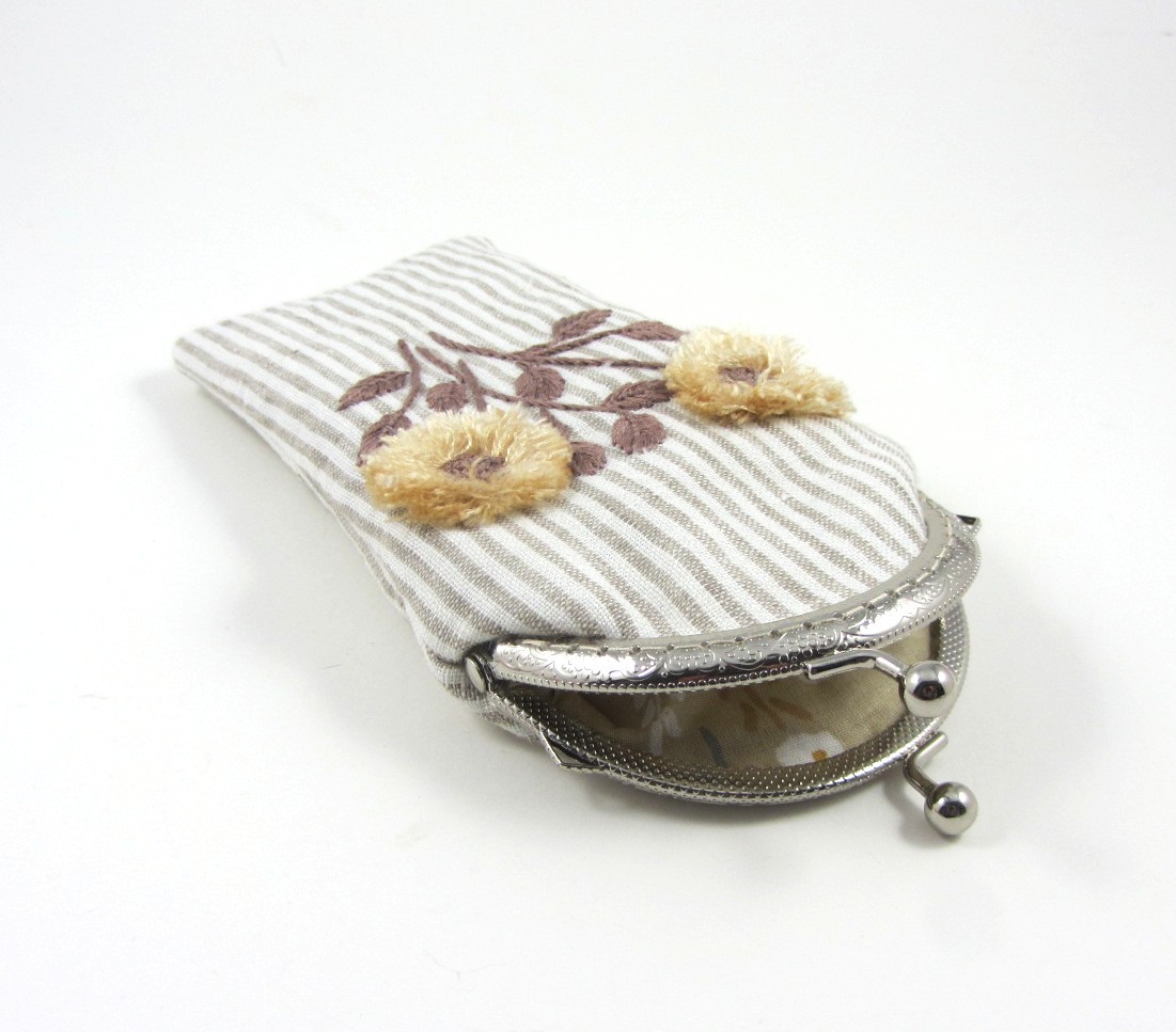 Soigneusement confectionnée dans un lin rayé et ornée d'une broderie artisanale unique, doublé et molletonné pour la structure et la protection.
