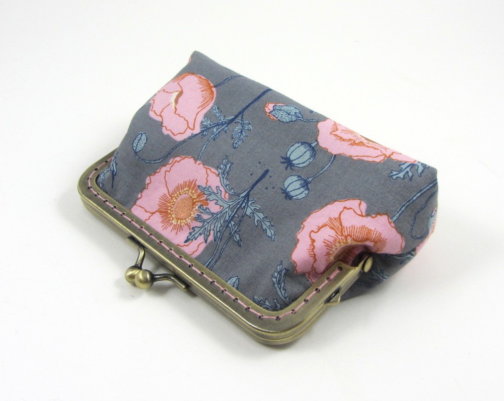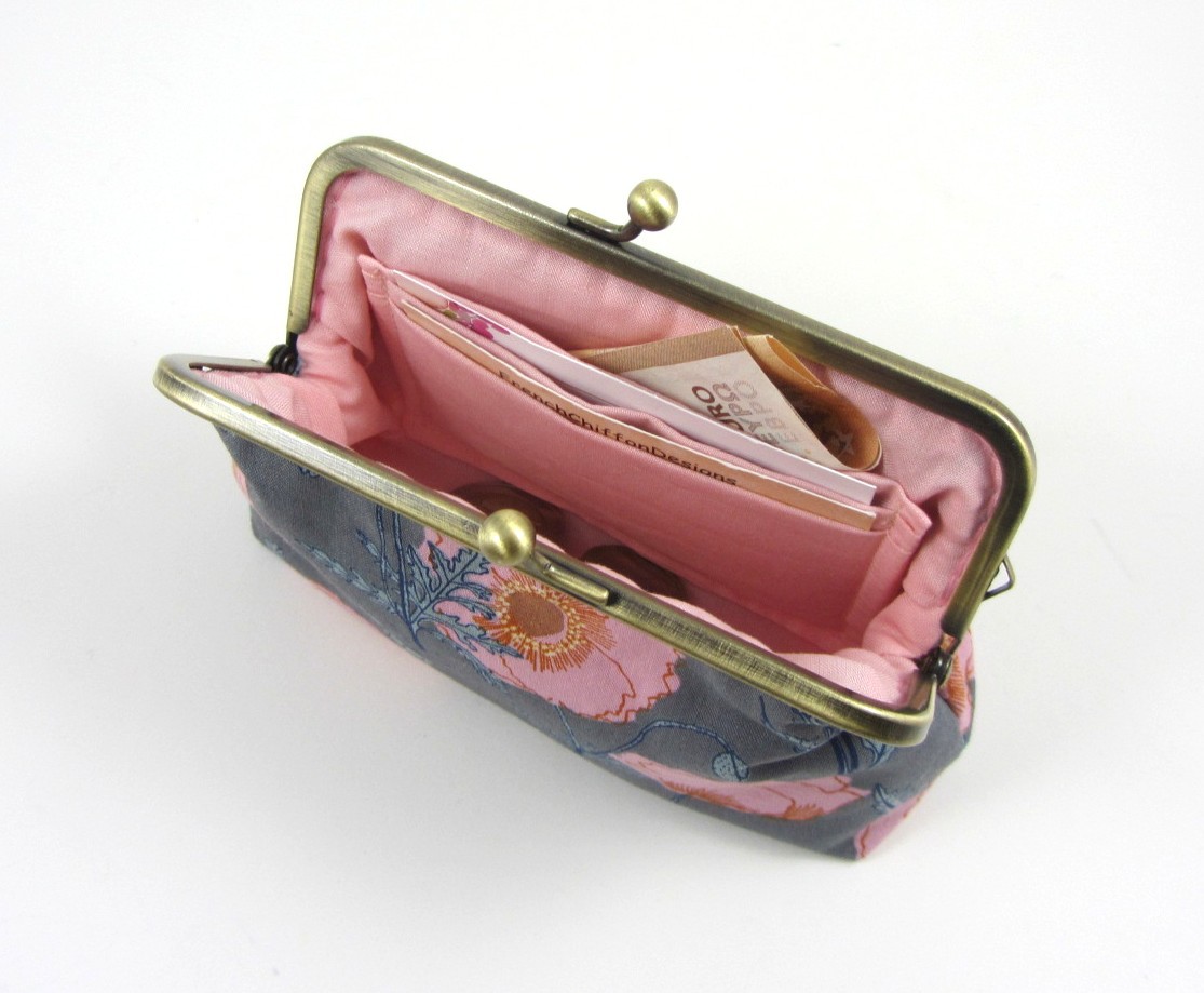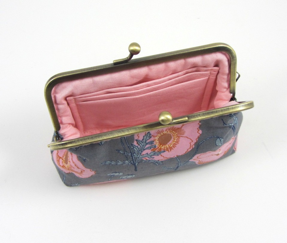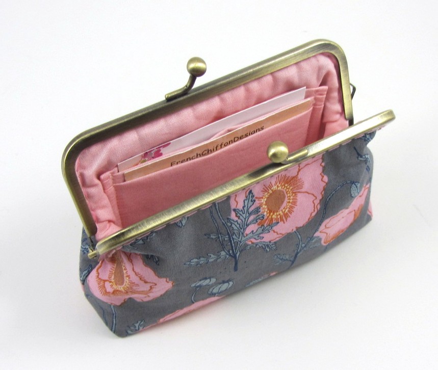 En coton gris fleuri dorés métallique, doublé et garni d'une double poche à l'intérieur, idéale pour ranger vos cartes et votre argent liquide en un seul endroit.