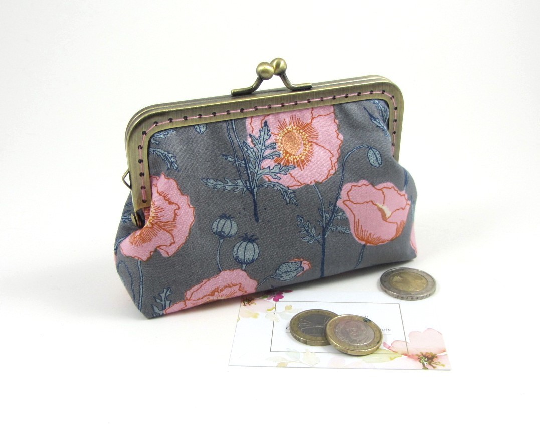 Porte-monnaie artisanal en tissu coton avec fermoir métallique style vintage. Pratique grâce à ses compartiments pour cartes bancaires ou identité, il est compact, élégant et unique.