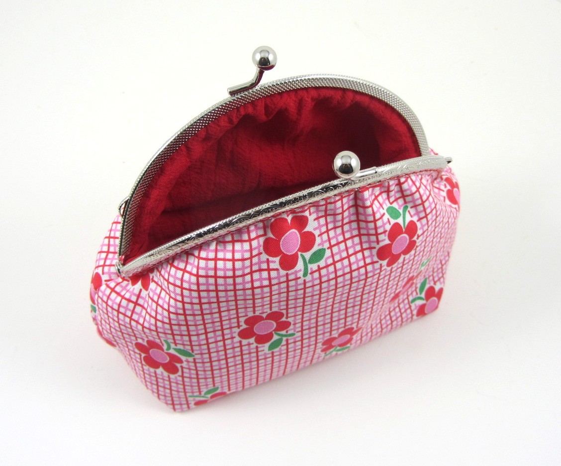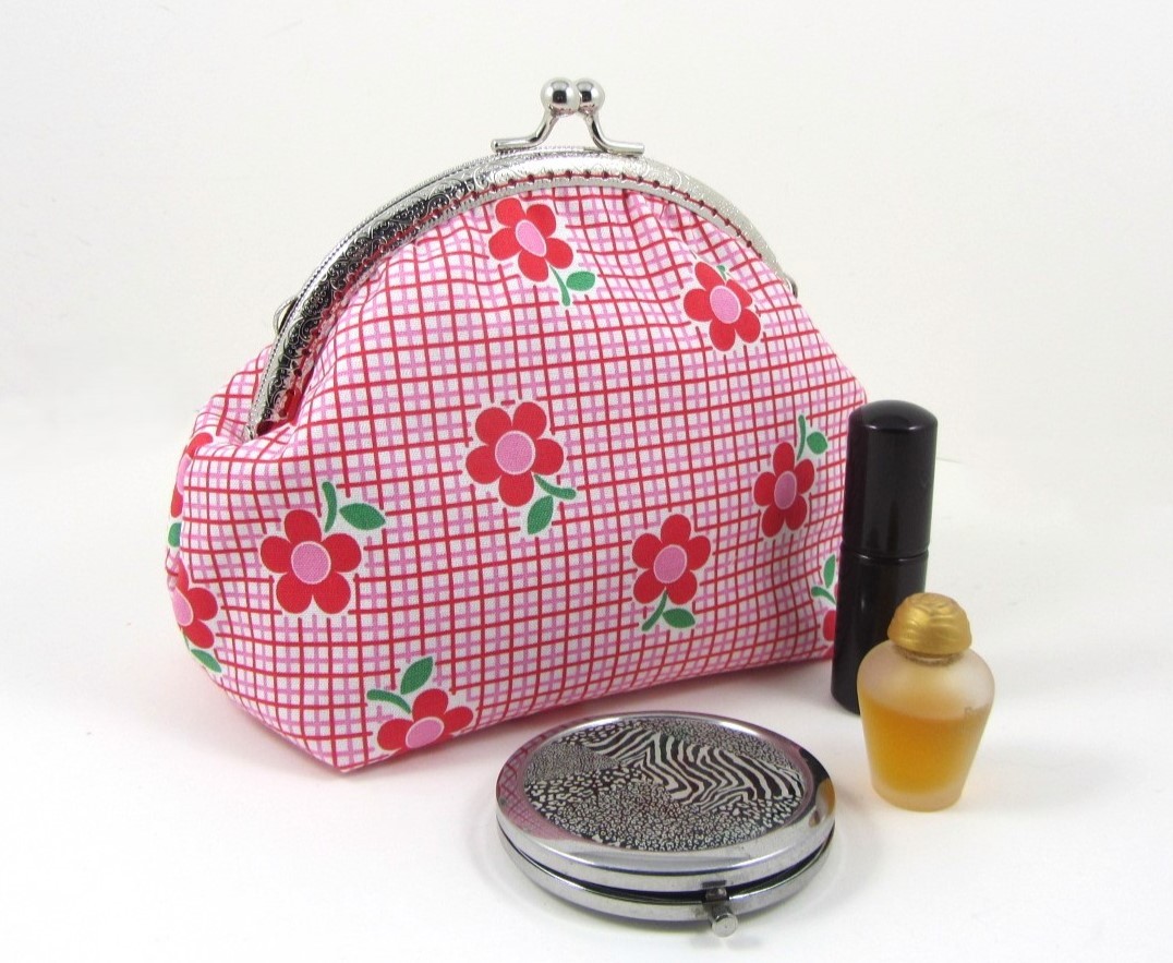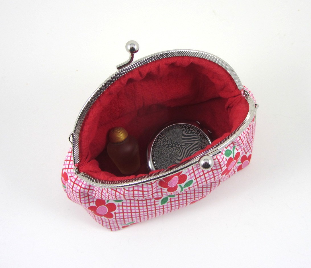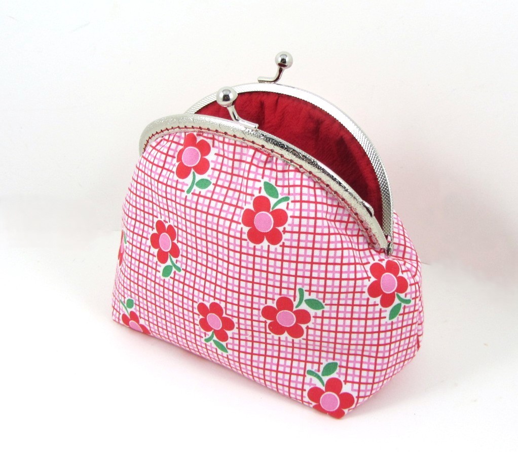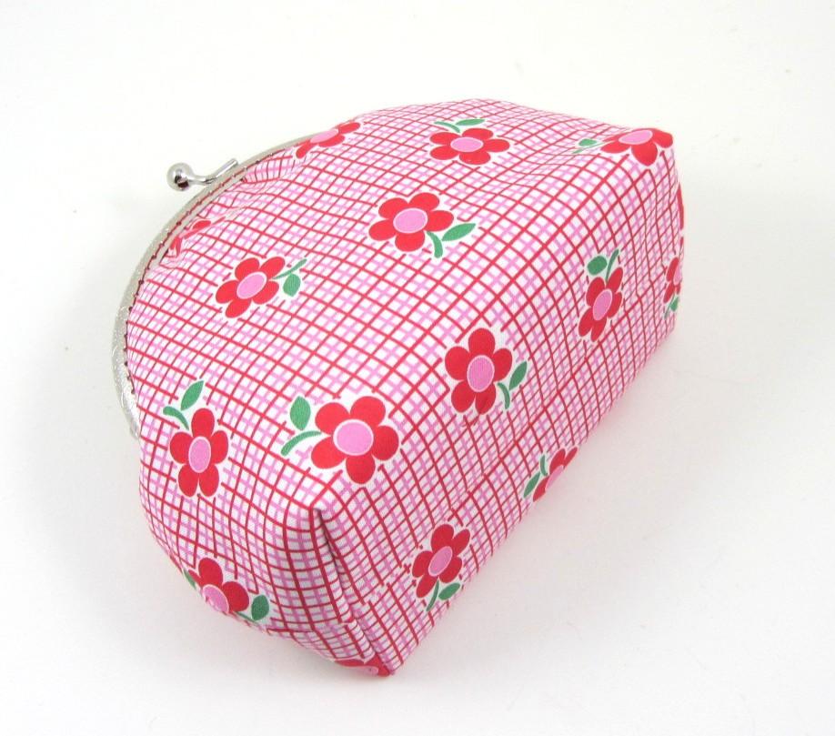 Transportez vos essentiels quotidiens dans cette trousse à maquillage faite main, confectionnée à partir de coton rouge Darling Posey de qualité et dotée d'une armature métallique classique.