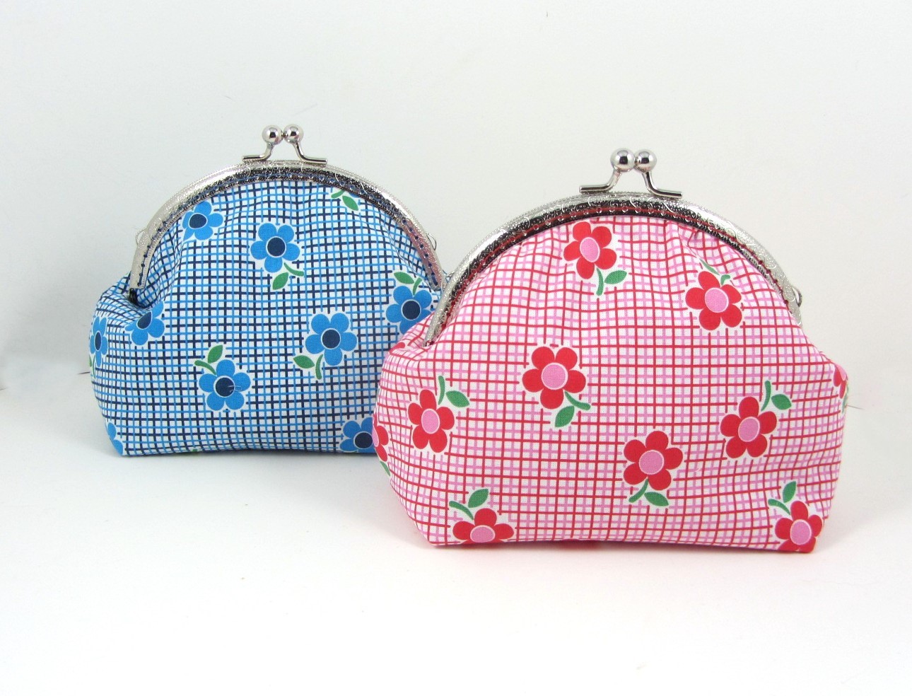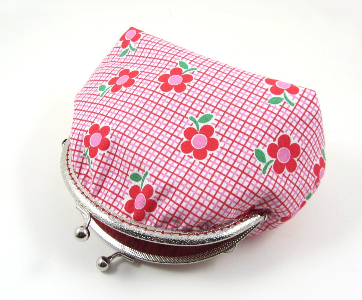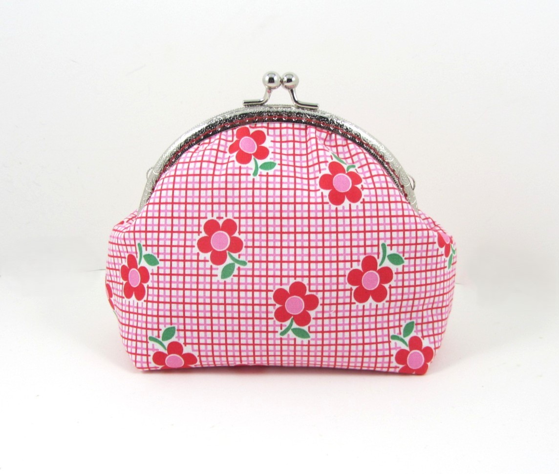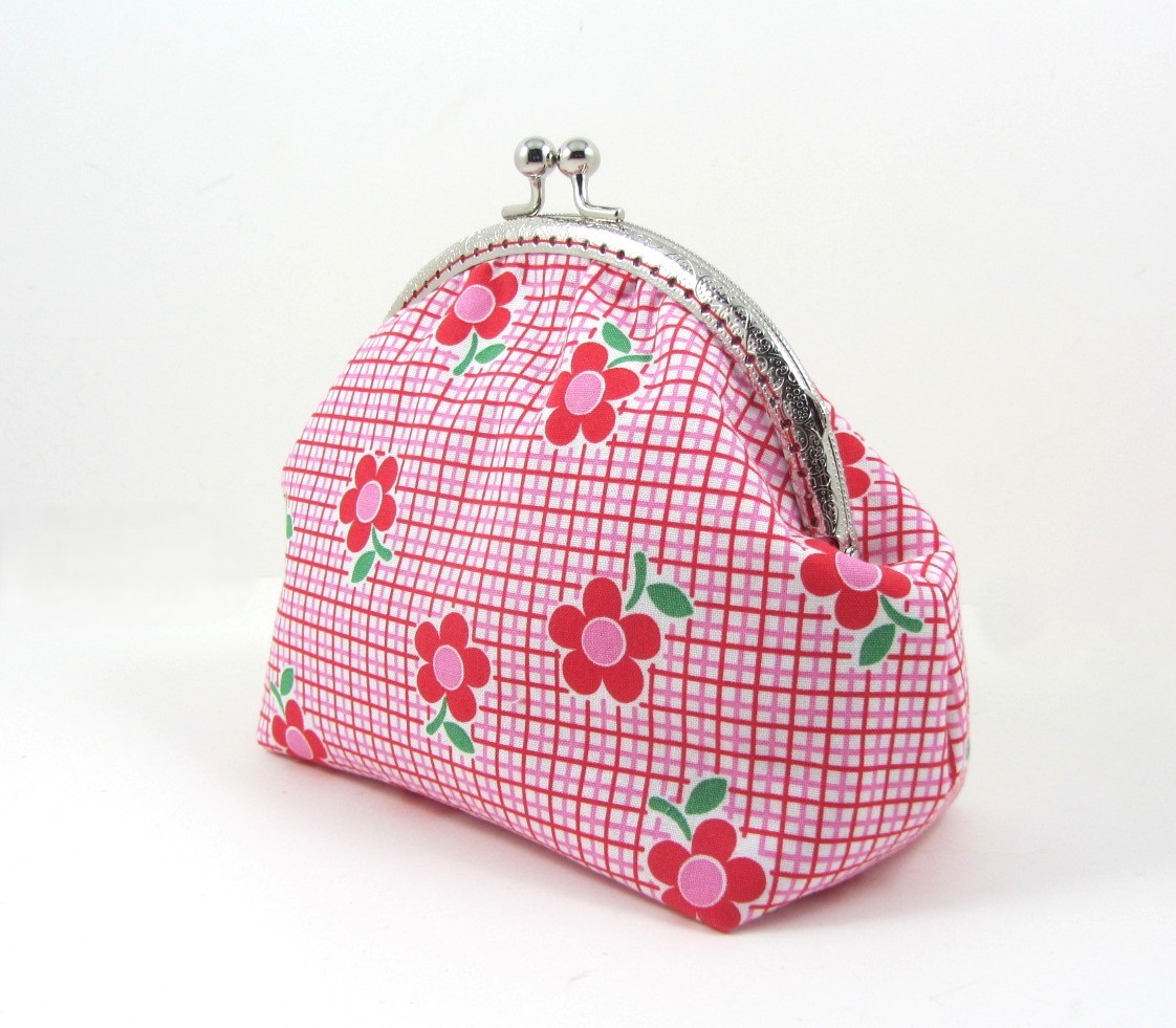 Transportez vos essentiels quotidiens dans cette trousse à maquillage faite main, confectionnée à partir de coton rouge Darling Posey de qualité et dotée d'une armature métallique classique.