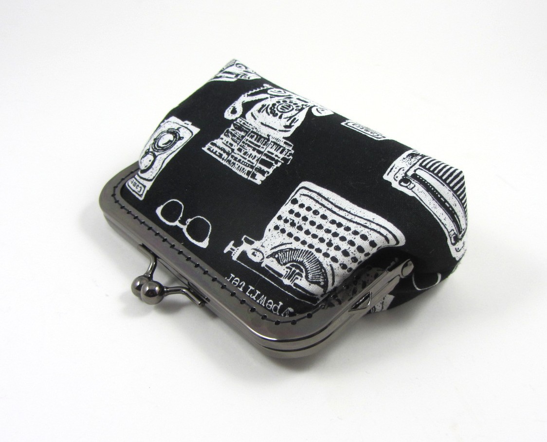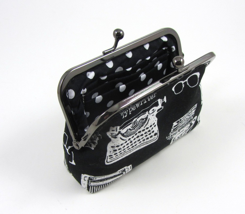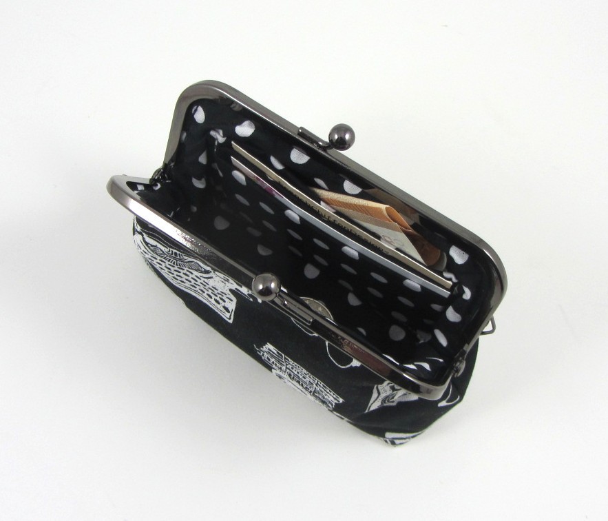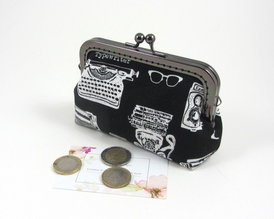 Porte-monnaie artisanal avec fermoir métallique noir, pratique grâce à ses compartiments pour cartes bancaires ou identité, il est compact et unique.